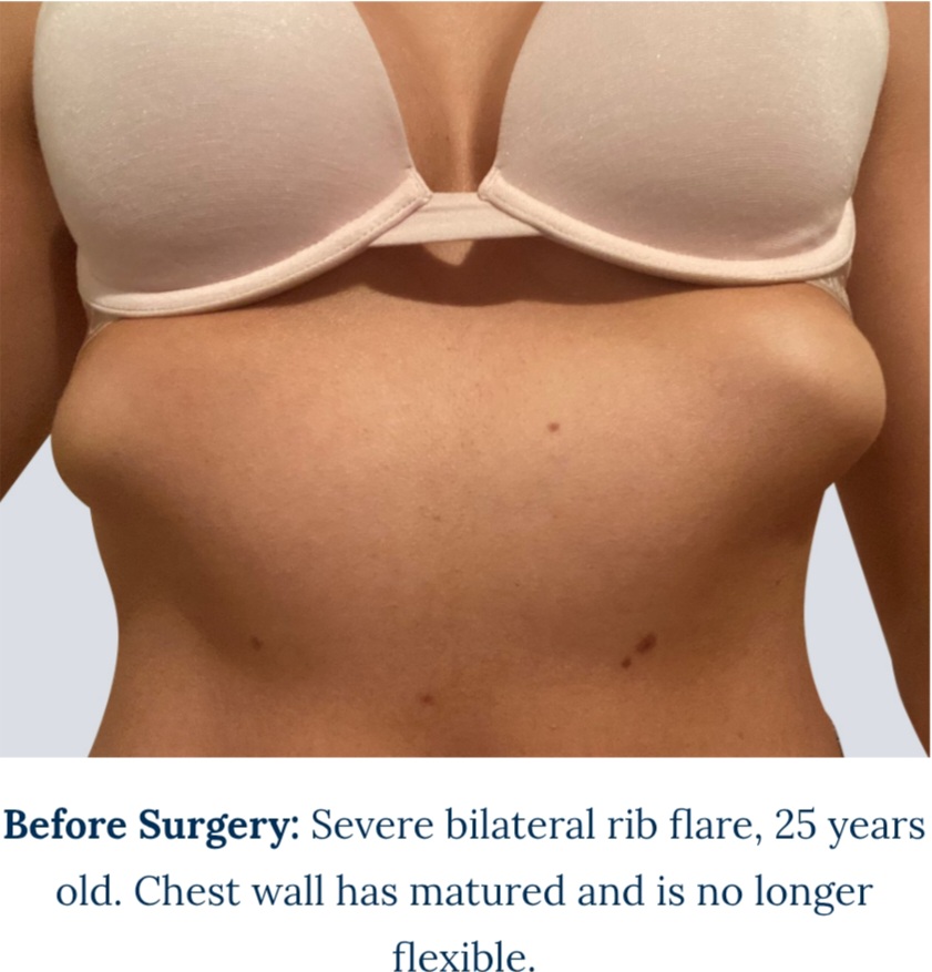 „for individuals with rib flare conditions and whose chest wall has matured and is no longer flexible to be easily manipulated with a brace into the corrective position, chest wall resection and reconstruction surgery may be a suitable option.“